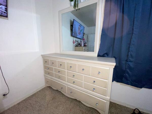 King size bed, dresser with mirror & 2 nightstands 1 big drawer Cama king size, tocador con espejo y 2 mesitas de noche, 1 cajón grande No deliver, only pickup truck or trailer needed No se...