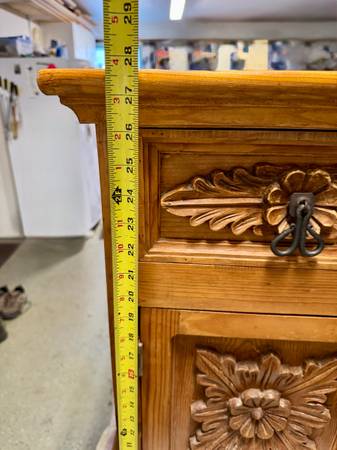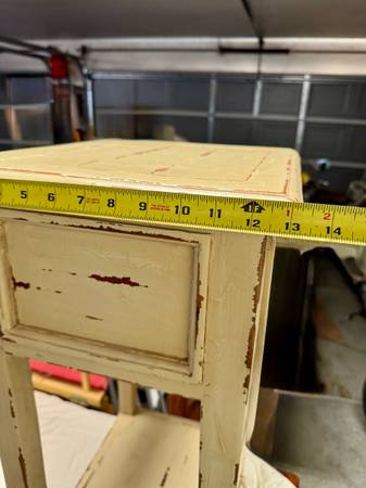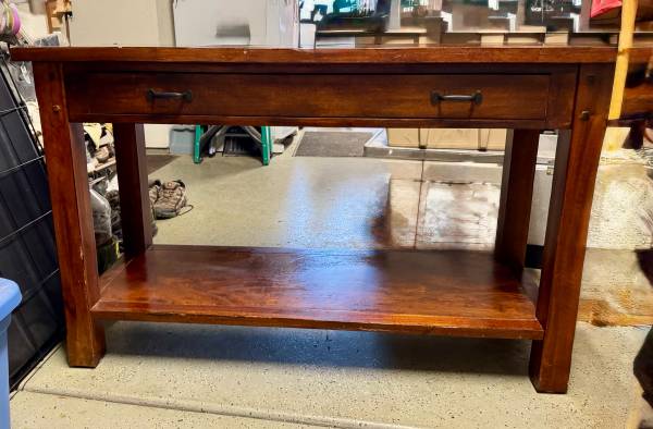 Sofa table, end table, night stand, whatever you want. These are furniture pieces made out of wood. Real wood. The one piece looks like it’s hard carved with mortise and through tenons (and a little chip in the wood). Drawers are dovetailed.