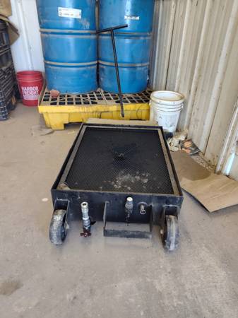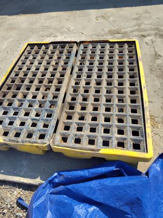 Oil Change Steel 20 Gallon Low profile Container With New Quick Connect Assembly & Quick connect Hose Connectors. Four Oil Drum Oil Capture Floor Yellow Base. Both For $175